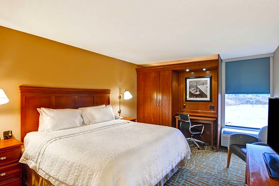32-inch LCD TV, work desk, microwave, refrigerator, coffeemaker, free WiFi access Enjoy a restful stay in this comfortable room with a king-sized clean and fresh Hampton bed®, an easy chair with ottoman and a 32-inch TV with HD channels. This room also features a large work desk, a microwave, mini-refrigerator and a coffeemaker. Free WiFi access will help you to stay connected when on the road. The bathroom contains plush towels and a shower featuring a curved shower rod for added space and light.